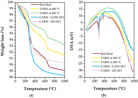 The TGA and DTA curves of the red mud sample and red-mud-based adsorbents are illustrated in Figure 5a,b, respectively. As shown in Figure 5a, the original red mud exhibited a mass loss of 7.5% between 80 °C and 400 °C, with most of this loss related to the evaporation of chemically bound water. In comparison, the samples thermally activated at 400 °C and 600 °C showed a lower mass loss than the original red mud, at 4.5% and 3.5%, respectively, indicating greater thermal stability. The DTA analysis (Figure 5b) confirmed this surface and crystalline water removal phenomenon, showing the exothermic reaction in the range of 200 °C to 400 °C. Furthermore, due to physically adsorbed water, the mass loss between 80 °C and 100 °C was minimal, at approximately 1.0% of the total weight. Still analyzing the first stage of mass loss for the chemically activated samples, a similar behavior to the original red mud was observed, with mass losses equal to 8.0% and 10% for the CARM-0.25M HCl and CARM-2M HCl samples, respectively.