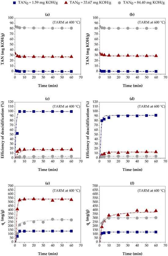 To assess the effects of free fatty acid contents on the deacidification process by adsorption, three distilled fractions were selected within the temperature range of 160 to 245 °C, each with a distinct TAN value, reflecting different levels of free fatty acids. These fractions included kerosene-like hydrocarbons with a TAN of 1.59 mg KOH/g, kerosene-like hydrocarbons with a TAN of 33.67 mg KOH/g, and kerosene-like hydrocarbons with a TAN of 84.40 mg KOH/g. Following this selection, the assessment of free fatty acid contents adhered to a methodology akin to that outlined in Section 2.4.2, where the deacidification efficiency and adsorption capacity were determined. This involved measuring the TAN values before and after treating the bio-oil fractions, enabling a correlation between the initial free fatty acid levels and the adsorbents’ performance in the deacidification process.