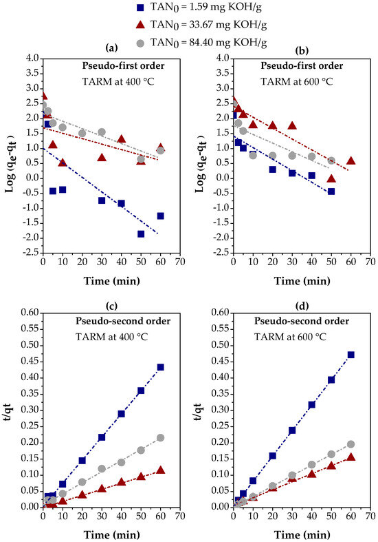Table 3 highlights a significant difference between the two kinetics models. The pseudo-first-order model (Figure 9a–c) showed an unsatisfactory correlation with the experimental data, especially for the samples treated with CARM-0.25M HCl and CARM-1M HCl. This behavior was confirmed by the R2 values, which were consistently lower than 0.900 for most of the adsorbent concentrations tested. These results indicate that the pseudo-first-order model is not adequate to describe the adsorption process of carboxylic acids in gasoline-like hydrocarbon fractions, possibly due to its inability to capture the complexity of the interactions between adsorbent and adsorbate. On the other hand, the pseudo-second-order model (Figure 9d–f) showed significantly better performance, with R2 values higher than 0.900, reaching up to 0.9999. These results suggest that the pseudo-second-order model provides a much more accurate representation of adsorption kinetics. The good agreement between the values of qe (exp.) and qe (calc.) observed in this model reinforces its adequacy, suggesting that the adsorption process is mainly governed by chemisorptive interactions [57,58], as frequently reported in the literature.