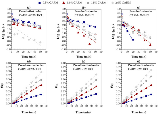 Evaluation of kinetics models for the adsorption of carboxylic acids in gasoline-like hydrocarbon fractions using different percentages of chemically activated red mud: (a–c) pseudo-first-order, using CARM-0.25M, CARM-1M, and CARM-2M, respectively; (d–f) pseudo-second-order, using CARM-0.25M, CARM-1M, and CARM-2M, respectively.