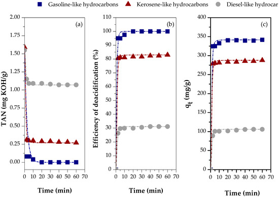 Adsorption kinetics of carboxylic acids in different distillate fractions using chemically activated red mud (CARM-1M): (a) TAN values, (b) percentage of carboxylic acids removed, and (c) adsorption capacity.