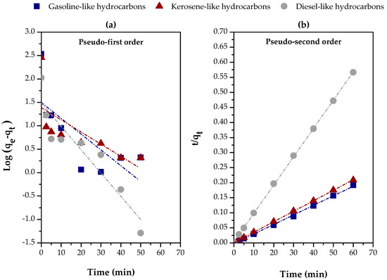 In terms of efficiency, the gasoline-like hydrocarbon fraction presented the highest hi value (initial adsorption rate), with 1806.7011 mg/g·min, while the diesel-like hydrocarbon fraction obtained the lowest, with 236.4066 mg/g.min, reflecting a lower initial adsorption capacity, possibly due to the greater molecular complexity of this fraction [21] and the lower accessibility of the adsorbent’s active sites [62]. In parallel, in the first 2.5 min, about 95%, 97%, and 84% of the equilibrium adsorption capacity were achieved for gasoline-like, kerosene-like, and diesel-like hydrocarbons, respectively, corroborating the initial adsorption rate values presented in Table 4.