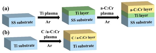 Figure 1. (a) S-series film fabrication process. An a-C:Cr layer is prepared with different parameters by adjusting the Ar atmosphere after depositing a Ti buffer layer. (b) T and C-series film fabrication process. On the Ti substrate, different process parameters are adjusted to deposit amorphous carbon films and a-C:Cr films in different Ar atmospheres, forming the C and T series, respectively.