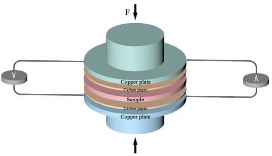 Figure 2. Schematic diagram of the ICR principle. The sample is composed of carbon paper and copper plate on both sides, respectively. During the test, a fixed current is applied, and the pressure on the sample is gradually increased through the copper plate. The values on the voltmeter are recorded. After that, the sample is taken out, and the same procedure is repeated. The data from the two experiments are calibrated to obtain the true contact resistance.