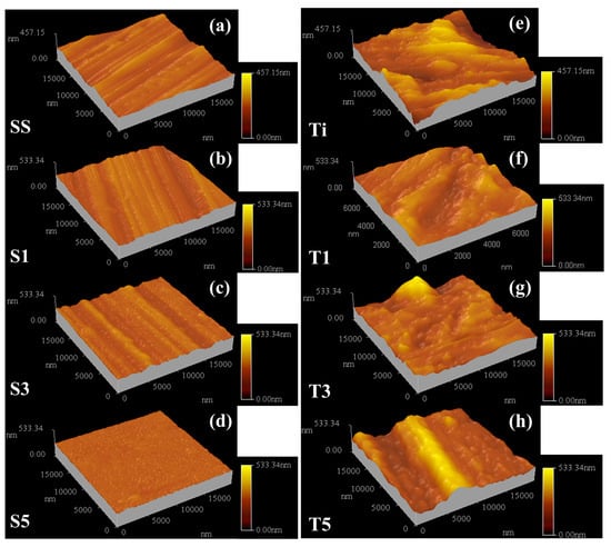 We used AFM to evaluate the surface roughness of the samples, as illustrated in Figure 3. Initially, we observed discernible striped patterns on the surfaces of both substrates, as depicted in Figure 3a,e. These were attributed to the utilization of unpolished commercial SS316L foil and Ti foil as substrates, with the stripes being remnants from the rolling process. The surface roughness (Sa) of the SS substrate was determined to be 12.1 nm, while that of the Ti substrate was found to be 43.1 nm. The surface roughness measurements for S1, S3, and S5 were 18.2 nm, 16.0 nm, and 4.5 nm, respectively. T1, T3, and T5 had surface roughness values of 24.2 nm, 27.8 nm, and 49.53 nm, respectively. Based on these findings, it can be concluded that the sputtered films are able to reduce substrate roughness and produce a smoother surface. However, the overall roughness is still affected by the rolling stripes because of the large scanning range.