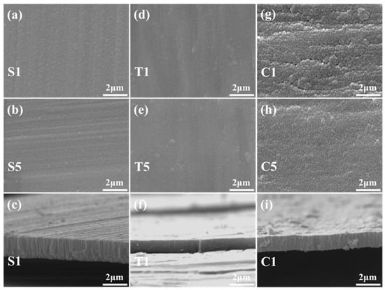 Figure 4. SEM images of the surface and cross-section morphology of the film. (ac) are the s series samples, (df) are the T series samples, and (gi) are the introduced C series samples.