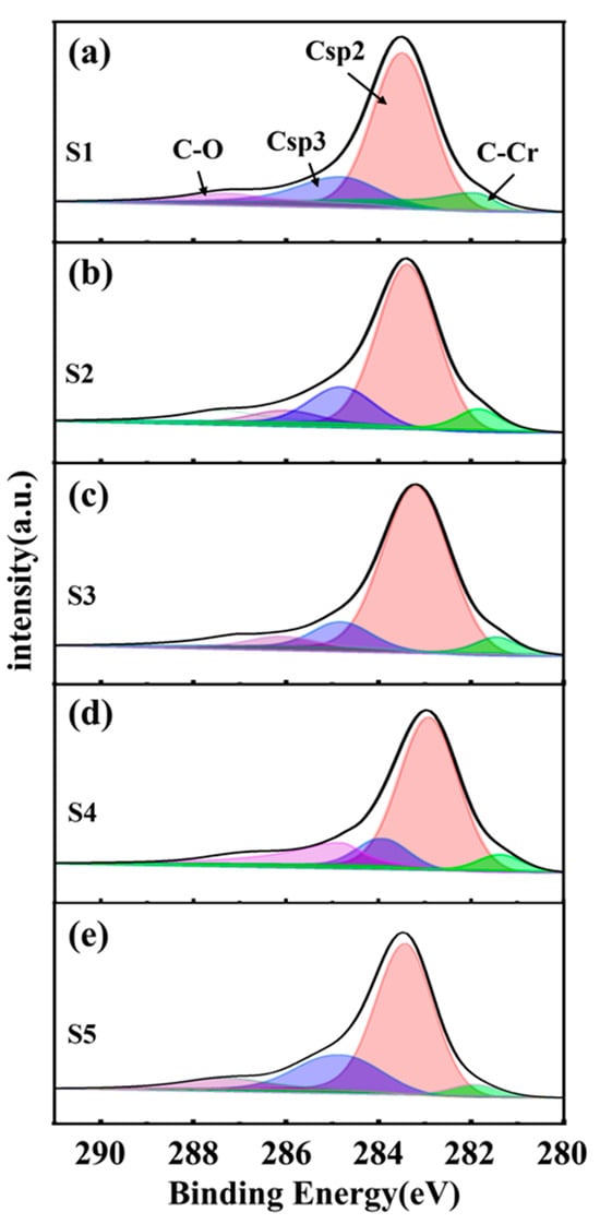 Taking the result of the XPS test of the multilayer film SS/Ti/a-C:Cr as an example, Figure 6 shows the C1s spectrum. Carbon is the primary constituent of the film. After employing Gaussian fitting, the obtained outcomes demonstrate that the sp2 peak is situated at 283.6 eV, while the sp3 peak is located at 284.8 eV. The C−O bond corresponds to 287.2 eV, whereas the C−Cr bond aligns with 281.8 eV [33]. The peak corresponding to the C−O bond with the highest binding energy is attributed to carbon compounds, indicating that it is a product of oxidation due to the sample being exposed to air. All XPS data were fitted using the same method as mentioned above. The carbon atomic content in different chemical states and the ratio sp2−C/sp3−C was directly calculated based on the ratio of the corresponding peak area to the total C1s peak area, as demonstrated in Table 2.
