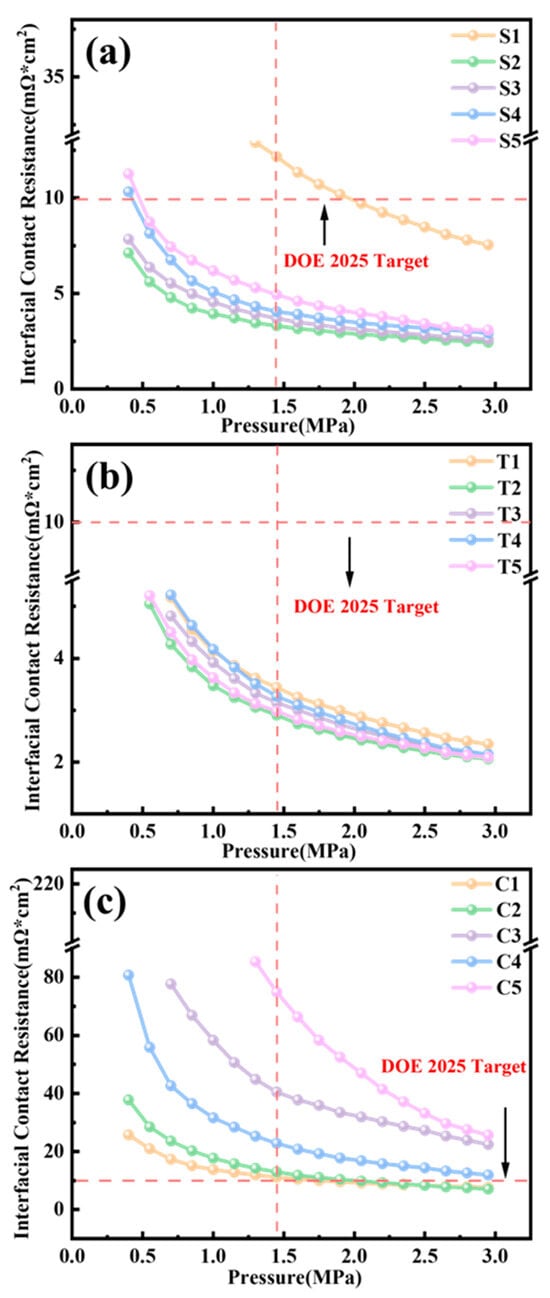 Figure 7. Graphs illustrating the variation of contact resistance with pressure for the S, T, and C series. (a) shows the variation of contact resistance with pressure in the s series. (b) shows the variation of contact resistance of the T series with pressure. (c) shows the variation of C-series contact resistance with pressure [21].