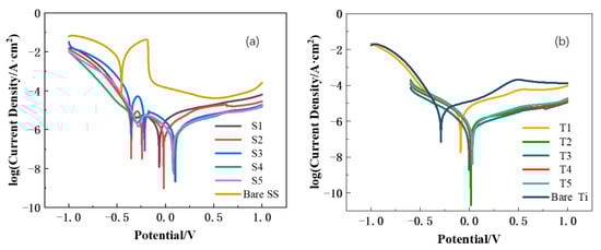 Figure 8. Dynamic potential polarization curves, with (a) representing the S series and (b) representing the T series.