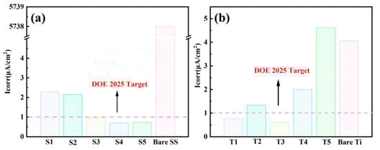 Figure 9. Corrosion current for the S series (a) and the T series (b) [21].