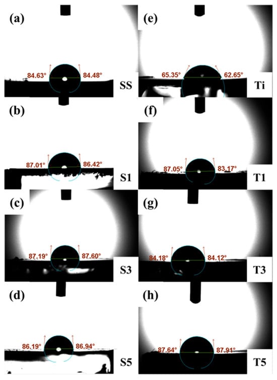 Figure 10. Water contact angles of SS substrate, Ti substrate, S series, and T series. (a) Water contact angle for SS substrate; (bd) are the water contact angles of the S series, corresponding to argon flow rates (300/400/500 sccm); (e) Water contact angle for SS substrate; (fh) is the water contact angle of the T series, and a-C: Cr thin films were obtained using argon gas flow rates of (300/400/500 sccm).