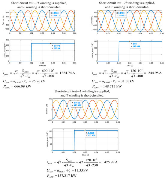 For verification of Equations (8) and (9), it was assumed that the considered autotransformer ratings are 400/230/33 kV, 600/600/120 MVA, YNa0d11, PcuHL = 666.09 kW, PcuHT = 148.713 kW, PcuLT = 157.317 kW, uk%HL = 11.04%, uk%HT = 7.97%, and uk%LT = 5.02%. The autotransformer parameters were calculated, and the results are given in Table 1. It can be observed that the individual impedances of the three windings computed in this manner can be used for modeling autotransformers with satisfactory results. To confirm this, a short-circuit test was carried out in a MATLAB/Simulink v. 2024b environment. To develop the autotransformer model, a multi-winding transformer from the Simulink library was used. Figure 4 presents the short-circuit test results for the developed autotransformer model. The obtained results (Pcu, uk%) match those specified on the nameplate of the considered autotransformer. Despite receiving the correct results, it can be observed that the reactance of the common winding, XC, is negative—a typical characteristic of the considered autotransformer model. This does not imply that it represents capacitance but rather is a consequence of the mathematical representation of such an autotransformer. The negative value of XC is mainly due to the arrangement of the windings and the mutual couplings in the middle winding region [14,15].