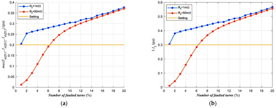 Turn-to-turn faults in common winding: (a) phase differential current as a function of the number of shorted turns, (b) negative-sequence differential current as a function of the number of shorted turns.