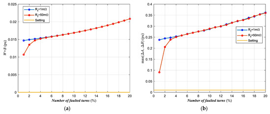At the beginning, the testing results of the negative-sequence current integral method are presented for turn-to-turn faults in an autotransformer, under the same conditions as those described in Section 3. Figure 13, Figure 14 and Figure 15 present the results for TTFs in series, common, and delta windings via fault resistances of 1 mΩ and 50 mΩ. The values of integral W + B as well as ΔA and ΔB criteria are presented as a function of the number of shorted turns. It can be seen that the proposed method can detect all turn-to-turn faults (even 1% of short-circuited turns and fault resistance 50 mΩ) in the series winding of the autotransformer. Both criteria exceed the threshold. The same situation applies to TTFs in the common winding of the autotransformer. The values of W + B are above the threshold for all cases, which indicates an internal fault. At the same time, the values ΔA and ΔB are only lower than the threshold for 1% of short-circuited turns in delta winding for fault resistance 50 mΩ (Figure 15). Therefore, this case was not detected by the negative-sequence current integral method.