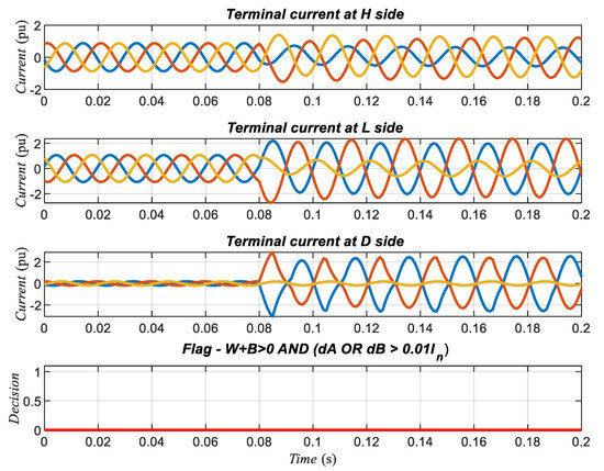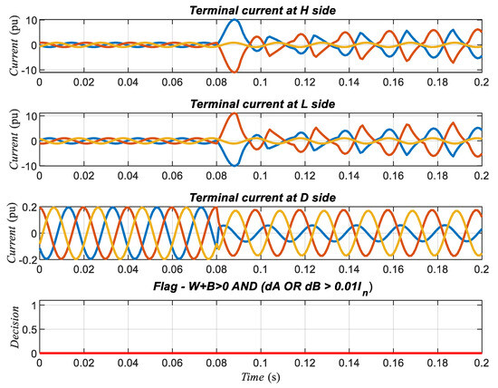 Further simulation cases have been prepared to test the proposed protection security during external faults. Figure 16, Figure 17 and Figure 18 present phase-to-phase external faults with CT saturation. Regardless of the fault location (external fault at a particular autotransformer side), the simulated external faults were recognized without issue, as the values of W + B were negative and the amplitudes of ΔA and ΔB were close to zero (both decision flags equal to zero). The presented cases prove that the negative-sequence current integral method works correctly during external faults (no tripping observed) even with severe CT saturation.