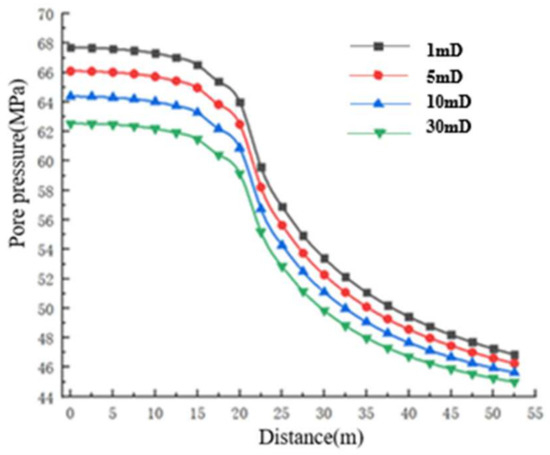 In this study, an innovative fracturing flooding method was adopted, where water is injected into low-permeability oil layers while production occurs from high-permeability layers. The permeability gradually increases from the injection well to the production well (Figure 9), and the flow characteristics under fracturing flooding conditions were analyzed.