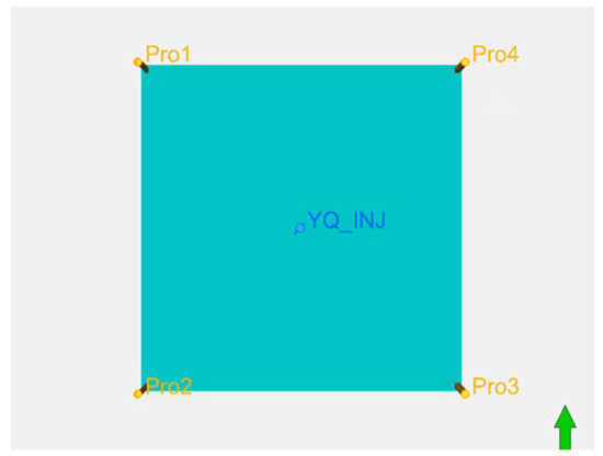 The model is a dual-porosity dual-permeability numerical simulation model with one injector and four producers. The model dimensions are 300 m × 300 m × 30 m (thickness), with a total of 36,000 grid cells. The model configuration includes 4 production wells and 1 water injection well. The schematic diagram of the model is presented in Figure 7.