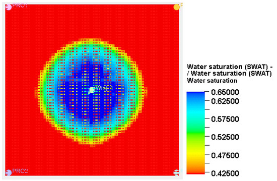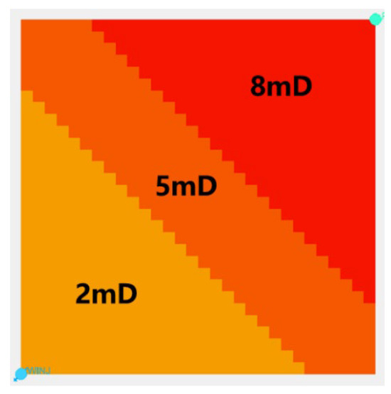 In this study, a series of models were established with permeability distributed in a low-to-high pattern between injection and production wells, where the average permeability was set at 5 mD. The influence of permeability contrast (ranging from 1 to 9) on hydrocarbon flow capacity was investigated. This configuration was designed to simulate permeability variations in real oilfields and examine how these variations affect hydrocarbon flow and displacement efficiency. Figure 18 displays the constructed models with different permeability contrasts. Through these models, the effects of permeability contrast on hydrocarbon flow characteristics can be systematically observed.