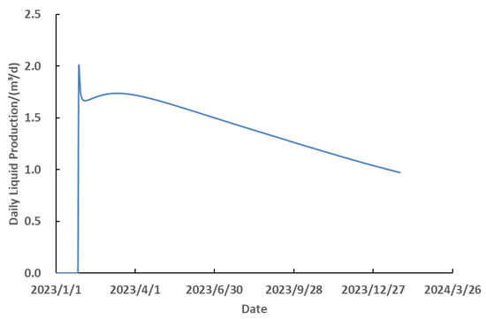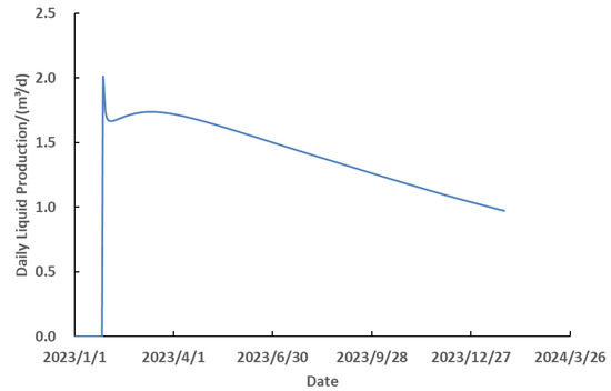 Figure 21 illustrates the specific model configuration and parameters, while Figure 22 presents the variation curves of liquid and oil production rates under different water injection volumes. These curves provide visual evidence of how water injection volume affects the efficiency of fracturing flooding flow and how injection strategies can be optimized to enhance overall oilfield production efficiency. The corresponding liquid and oil production rate data under different injection volumes are detailed in Table 9.