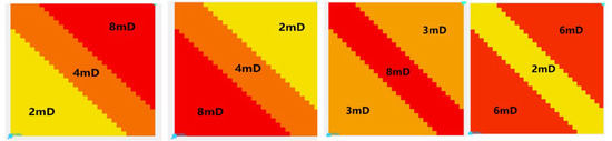 All models were configured with an identical average permeability of 4.7 mD to ensure experimental consistency and result comparability. This value was selected based on typical oilfield conditions and facilitates direct comparison with existing research findings. Figure 12 illustrates the heterogeneous distribution patterns employed, which encompass a range of permeability configurations from simple to complex. Each pattern was designed to simulate distinct geological and physical characteristics of hydrocarbon reservoirs.