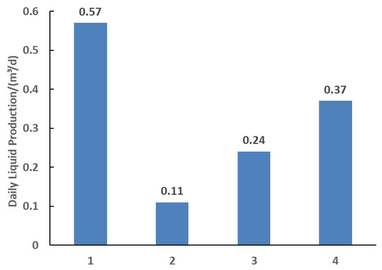 Bar chart of liquid production rates under different heterogeneous distribution patterns.