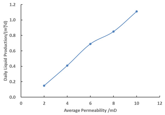 This study conducts a detailed analysis of the calculated liquid production rate per unit thickness and oil production rate under different permeability levels, as presented in Figure 16 and Figure 17. The results reveal that the fracturing flooding seepage capacity exhibits an approximately linear increasing trend with rising average permeability. This finding demonstrates that average permeability is a crucial factor influencing fracturing flooding flow capacity. The corresponding production data for different permeability levels are provided in Table 5 and Table 6.