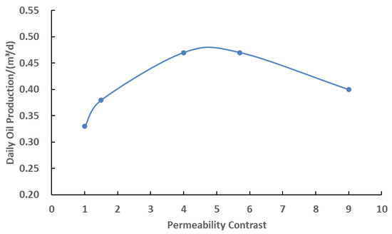 Oil production rates at different permeability contrasts.