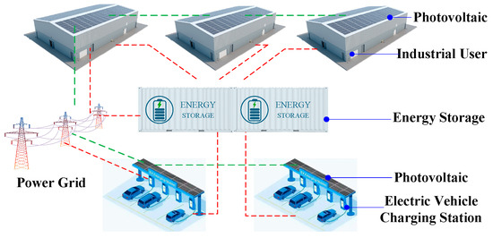 With the continuous growth of the global economy, the demand for electricity in industrial parks is rising, and the wide application of electric vehicles (EVs) has further aggravated the demand for charging energy in industrial parks [1]. In this context, the construction of the charging station (CS) integrated with a photovoltaic and shared energy storage system (PV-SESS-CS) in the park has become an efficient solution. By integrating stable industrial loads into PV-SESS-CS, a deeply coupled and integrated operation pattern of ‘generation–load–storage–charging’ can be established. Given that most industrial parks in China adopt a unified electricity account and centralized settlement mechanism, all users typically share a common grid connection point and a single electricity account, with all electricity transactions settled collectively by the park operator. As a result, the shared energy storage system (SESS) generally lacks the metering, access rights, and pricing mechanisms required to participate in electricity markets and is primarily used for internal load balancing and photovoltaic (PV) output optimization within the park. In the planning and construction of SESS, how to rationally allocate energy storage capacity has become a key issue. Reasonable energy storage capacity configuration can not only optimize the operating efficiency of the power system but also provide necessary power support when the photovoltaic output is insufficient or the charging demand of electric vehicles is at its peak [2]. In addition, carbon emission reduction has become an important factor in the development of industrial parks. Considering carbon reduction benefits in the energy storage configuration process not only helps reduce greenhouse gas emissions but also brings policy support and economic incentives to the park, thereby enhancing its capacity for sustainable development [3].