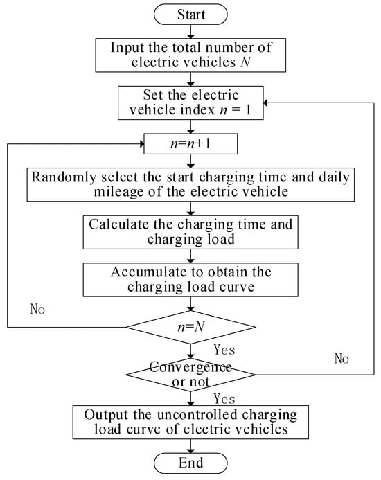 In this study, MCS is used to simulate the disorderly charging behavior of park owners. Suppose that the EV is charged once a day until it is full. In the company’s work charging scenario, EVs usually adopt a slow charging method with a more stable charging process and less impact on battery life. Therefore, the whole charging process of EVs can be approximated as constant power charging. The simulation process of the disordered charging load of EVs is shown in Figure 3, and the specific steps are as follows.