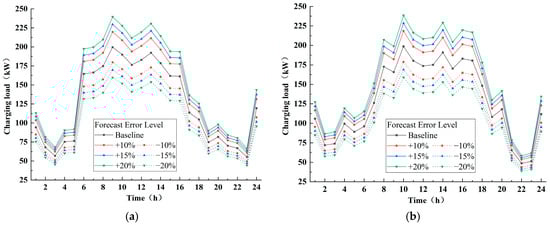 Predicted charging load curves of CS A and CS B under different forecast errors. (a) CS A; (b) CS B.