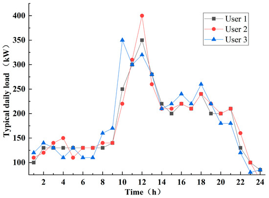 In this study, three IUs and two CSs are selected for example analysis. The typical daily load curves of the three IUs are known, as shown in Figure 8. In addition, the forecasted load curves for the two CSs were generated in Section 4.1.2, as shown in Figure 4. The predicted PV output curves for the three IUs and two CSs were generated in Section 4.2.2, as illustrated in Figure 7. The optimization model is solved using the Gurobi solver from MATLAB R2023b.