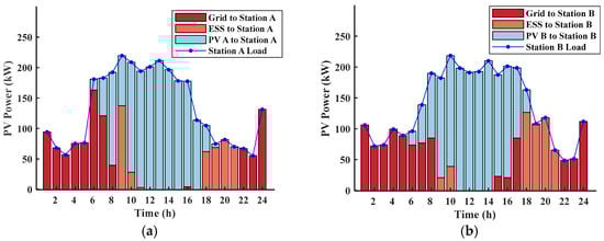 Figure 11 shows a power balance diagram of the two CSs. At noon, the PV output power is greater than the power load of the CS. After the PV meets the load of the CS, the excess power will be delivered to the energy storage station or sold to the grid. When 18 h–21 h is the evening peak of electricity consumption, the electricity purchase price from the power grid is higher, and the CS preferentially uses the power of SESS to realize the cyclic scheduling of energy. When SESS is exhausted or the electricity price is reduced, the power grid is used for power supply. From the above analysis, it can be seen that the use of SESS in the peak load period of the power grid is helpful to reduce the pressure on the power grid and optimize the operation of the whole power system.