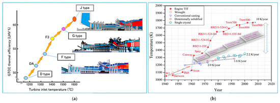 Development in gas turbine: (a) TIT effects on gas turbine power and effectiveness and (b) Evolution of temperature capabilities of materials and thermal barrier coatings (These figures are reproduced from [2,5] under a Creative Commons Attribution (CC BY) license).