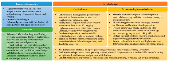 The prior review articles on transpiration cooling have been widely established, mainly for aerospace and high-speed vehicles. Figure 3 summarizes the benefits, existing key challenges, and solutions, highlighting its implementation feasibility for gas turbines and high-speed vehicles. Most reviews [5,36,37,38,39,40,41,42,43,44,45,46] affirmed that transpiration cooling held significant promise for these applications due to high cooling performance, customizable design, and enhanced surface protection. Advances in AM technology enabled the fabrication of precision micro and transpiration cooling structures, addressing critical challenges such as particle-induced clogging, mechanical integrity, and manufacturing limitations. Additionally, research on hybrid cooling methods has been advancing, aiming to enhance thermomechanical performance under extreme conditions.