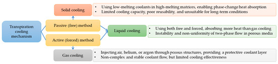 In previous studies, transpiration cooling is also called sweat [47], effusion [48], or full-coverage film cooling [49]. Therefore, it is essential to understand the classification of transpiration cooling, as this framework defines the cooling capacity, material requirement, and manufacturing effect that guide design and performance evaluation. Transpiration cooling employs three primary mechanisms, classified based on working conditions, as summarized in Figure 4 [44]: solid cooling using phase-changing metals for passive heat absorption [50], gas cooling via forced flow through porous structures [49,51], and liquid cooling combining passive and active methods with phase-change enhancement [52,53,54]. The passive approach relies on material vaporization, while forced methods create protective coolant boundary layers through porous media.