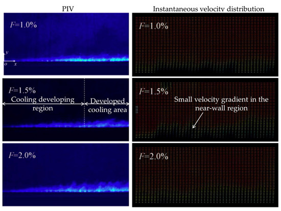 The particle image velocimetry (PIV) image and instantaneous velocity distribution [49] in Figure 9 show that the boundary layer remains thin in the initial cooling development region of a relatively small-diameter perforated plate. As coolant air accumulates downstream, progressive boundary layer growth is observed through the transition zone until reaching the developed cooling region. Within the developed cooling area along the wall, the boundary layer thickness stabilizes, maintaining near-constant values across the entire stabilized zone. Additionally, the boundary layer growth rate strongly depends on the cooling supplied rate, increasing linearly with coolant mass flux. Overall, this relationship closely resembles that in the sintered porous-based transpiration cooling structure [49]. Therefore, the diagram in Figure 8 could also be used to explain the flow and heat transfer phenomena of non-stochastic architectures fabricated through AM technology.