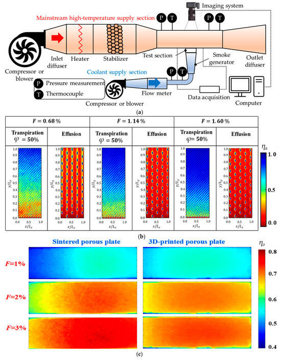 General experimental setup for investigation on flow and heat transfer of transpiration cooling: (a) Schematic diagram; (b) Illustration of ηa contours (Reproduced with permission from [92]. Copyright 2024 Elsevier) and (c) ηo distributions (Reproduced with permission from [51]. Copyright 2018 Elsevier).