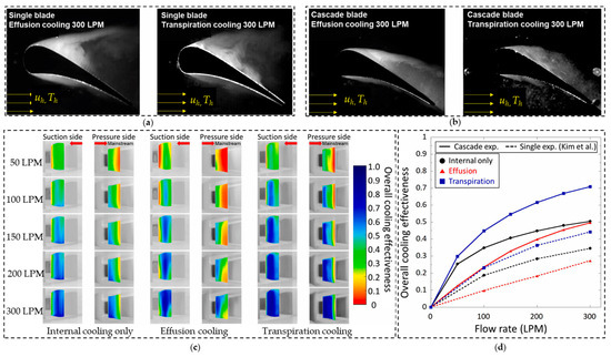 Transpiration-air cooled turbine blade: (a) visualization of coolant flow at uh = 20 m/s and coolant volume flow rate of 300 LPM for the single blade; (b) for the cascade blade; (c) ηo distributions on the cascade blade with different cooling; and (d) comparisons of area-averaged cooling effectiveness between cascade and single-turbine blades from Kim et al. [73]. Reproduced with permission from [30]. Copyright 2022 Elsevier.