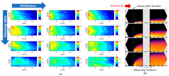 A porous Hastelloy-X transpiration-cooled plate: (a) contours of ηa at BR = 0.5, 0.8, 1.5, and 2.0 and t = 0.5, 1.0, and 2.0 mm and (b) IR images of concentration of ejected air at BR = 0.5, 0.8, 1.5, and 2.0. Reproduced with permission from [74]. Copyright 2024 Elsevier.