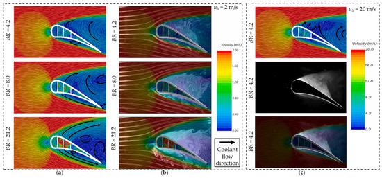 Kim et al. [95] also used smoke-laser visualization with two diode-pumped solid-state lasers and olive oil seeding to visualize coolant flow release from the blade; then, the flow characteristics were captured by a high-speed CCD camera. It was revealed that transpiration cooling provided uniform coverage and low-momentum discharge, which prevented recirculation flow, while effusion cooling showed a large layer thickness, as shown in Figure 11a. Despite comparable coolant-to-mainstream pressure ratios, transpiration cooling required less coolant for better performance. A subsequent study [30] was conducted on a C3X cascade-turbine blade compared with different cooling methods, namely internal cooling only, effusion cooling, and transpiration cooling. They observed that in cascade blades, adjacent blades redirected and accelerated the flow along the blade chord, as shown in Figure 11b. It was obvious that the transpiration cooling showed more uniform and higher cooling effectiveness, as seen in Figure 11c. Moreover, compared to a single blade, the coolant outflow formed a thinner boundary layer in effusion and transpiration cooling. This shifted the suction-side vortex rearward, reducing mainstream/coolant mixing and stabilizing the coolant within the boundary layer. Due to these flow interactions, the cascade arrangement enhanced cooling effectiveness, as shown in Figure 11d.