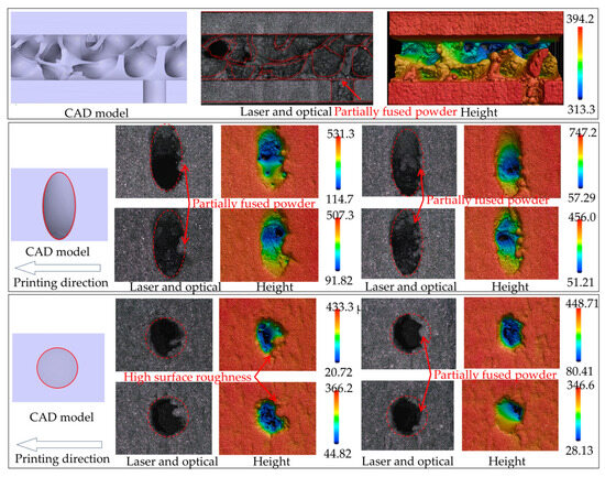 where Vdes represents the designed volume of a geometry from a CAD model (m3). Vsol is the volume of a solid domain with identical dimensions (m3). Mdes signifies the measured weight of a test specimen, while Msol is the measured weight of the solid plate (kg).