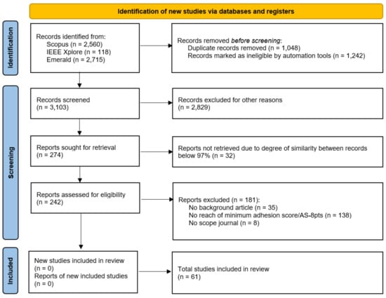To answer these guiding questions, the following methodology used the Preferred Reporting Items for Systematic Reviews and Meta-Analyses (PRISMA), which is a useful tool for ensuring that all the information recommended by its guidelines is captured during the organization and execution of systematic reviews, in addition to improving their reporting [36]; similar usage has been observed in Stavropoulou et al. [37], Ciccozzi et al. [38], and Marco-Lajara et al. [39]. Using the PRISMA method, combined with VosViewer version 1.6.20, Mendeley v1.19.8, and GPS Visualizer software, it was possible to organize, evaluate, analyze, and systematize the most current research from 2019 to 2024, as well as the most relevant articles on the subject. Therefore, by outlining a roadmap for future research, this article will be able to guide academics and professionals in carrying out more in-depth and comprehensive studies that advance knowledge, foster innovation, and promote sustainable practices in concrete construction.