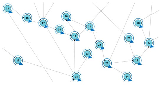 In order to capture the spatial topology of the grid, a directed graph is constructed based on the directional links between buses, as shown in Figure 2. Each node corresponds to a bus in the IEEE 118 bus system, each edge represents the directional link between the two buses, and the direction of the edge arrow indicates the direction of power transfer. To ensure stability during training and avoid isolated nodes, self-loops (blue arcs) are added to all nodes.