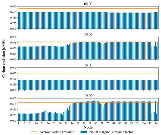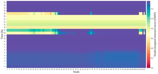 Figure 3 shows the NMEF results throughout the 24 h of 6 July using a heatmap. The horizontal axis represents nodal numbers 1–118. The vertical axis represents the time progression from 0 to 23 h. Different colors within the heatmap indicate the NMEFs at each node. As shown in the figure, during the high-load period from 12 to 19 o’clock, most nodes’ marginal carbon emissions remained within the stable range of 0.2–0.4 t/MW, indicating that increasing the load by 1 MW results in a relatively low NMEF. Continuing increasing demand at those nodes will not incur high emissions from 12 to 19 o’clock. However, some nodes (e.g., node 81) experienced a sharp increase in the NMEF to 0.6 t/MW and above throughout the early morning and evening. The reason for this scenario was network congestion; a high NMEF value indicates that a decrease in demand on those loads could reduce carbon emissions significantly.