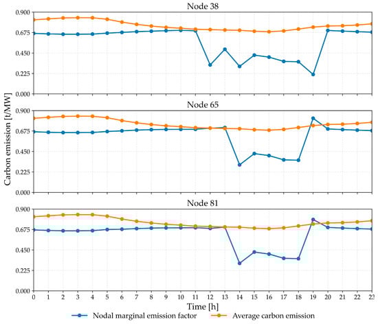 Figure 5 shows the NMEF values significantly change throughout 24 h for those three nodes. Before 11 o’clock, the profiles of the NMEF and ACE show a contrary tendency, i.e., when ACE is high, NMEF is low, and vice versa. During the afternoon period, the NMEF values for most nodes are significantly lower than the ACE values. This implies that those nodes could accept more demand without increasing the total carbon emissions significantly. These characteristics could be considered in power system unit-commitment for efficiently controlling overall carbon emissions. Second, nodes 65 and 81 experience a sharp increase in NMEF at 19:00. This is caused by transmission congestion, where power plants with lower emission rates cannot respond to the load change on nodes 65 and 81.