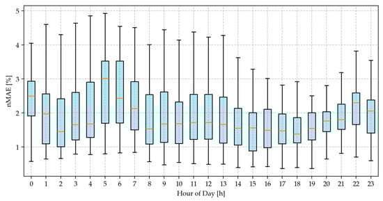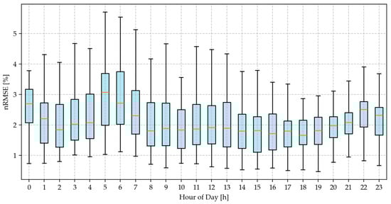 By mapping the load demand, voltage angle, generator output, node-level carbon emissions, renewable generation (wind and solar), generator type, system-level carbon indicators (total and average emissions), and total power generation to the NMEF via the GNN model, the characteristics of NMEF have been developed. To assess the temporal accuracy of the model, Figure 6 presents the hourly distribution of the nRMSE across all nodes in the system.