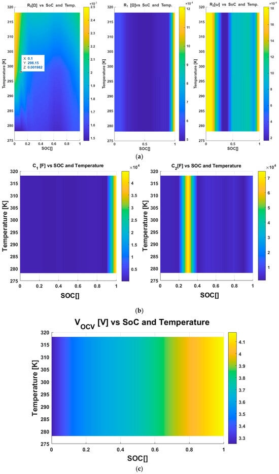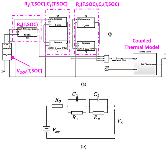 - SOC Estimation: Battery state function (2) is assumed, where the modeled states are the battery’s SOC and the voltage differences measured across two RC groups, V1 and V2 (2):