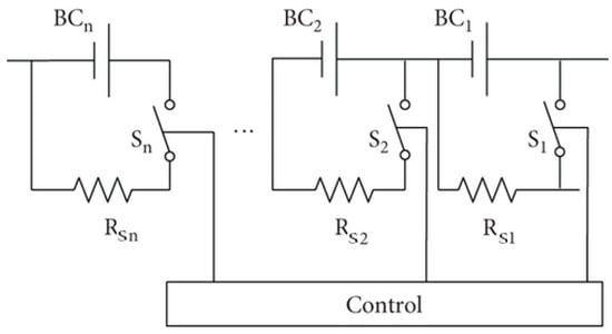 - Cell Balancing: Differential aging and natural construction tolerance result in cell unbalancing [21]. For this reason, the BMS is often integrated with a balancing circuit that can be used actively or passively to restore the system. In this study, a model of a passive resistive balancing circuit, taken from the authors of [22], is implemented. The cells are balanced through commutated shunt resistors according to the circuit scheme described in Figure 7. When balancing is activated, the connected cells (Figure 6) are discharged on passive resistors (Rsi) that are connected or disconnected, acting on the controlled relay/contact Si. The activation logic is relatively simple: During balancing, the maximum voltage of a cell, Vcell_ref (lower than 4.2 [V]), is defined, and if this threshold is exceeded, the cell is shunted and discharged by the corresponding resistor. To avoid excessive chattering with respect to the controlled contact, hysteresis (of about 0.02 [V]) is introduced in the commutation logic.