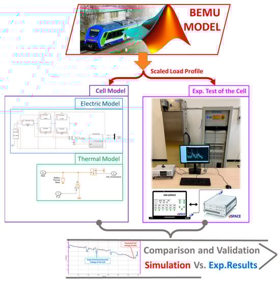 - Application of a Scaled Railway Mission Profile and Validation: A scaled mission profile of the BEMU train is applied to both the tested and simulated cells. A comparison between the experimental and simulated responses of the cell is used to further validate the identified model.