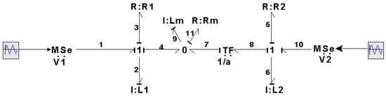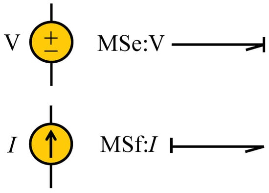 A bond graph is a system modeling methodology based on the transfer of power between its elements. The fundamental elements of bond graphs are the power bonds, as shown in Figure 1. Two generalized power variables are associated with each bond, called the effort and flow which, for electrical systems, correspond to the voltage and current , respectively [,,].